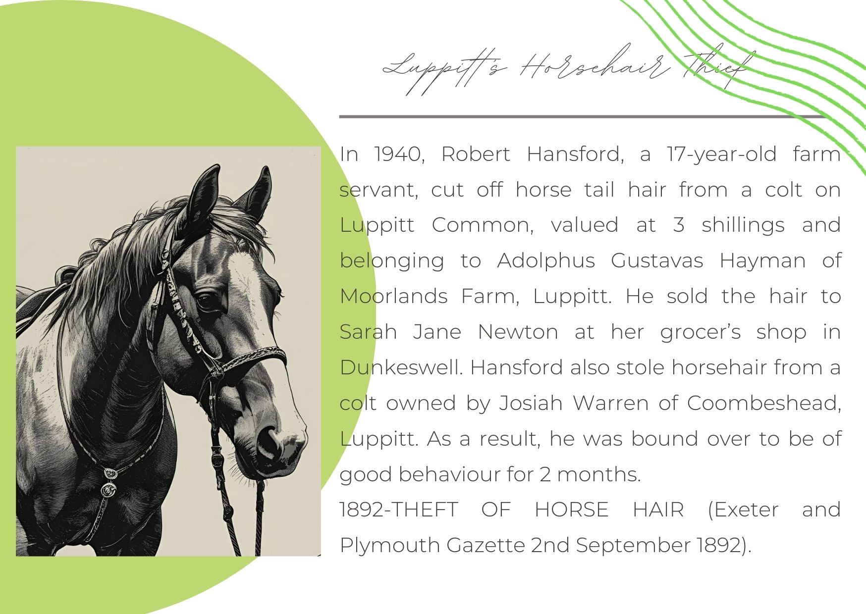 Drawn from local archives, census records, newspapers and community memory, they reveal the breadth of Luppitt’s past: from Romany Gypsies to wartime farming and American searchlights in the Second World War, from horsehair thiefs to skylarks on Hartridge. Together, they offer a vivid snapshot of the people and events that have shaped Luppitt’s historical landscape.